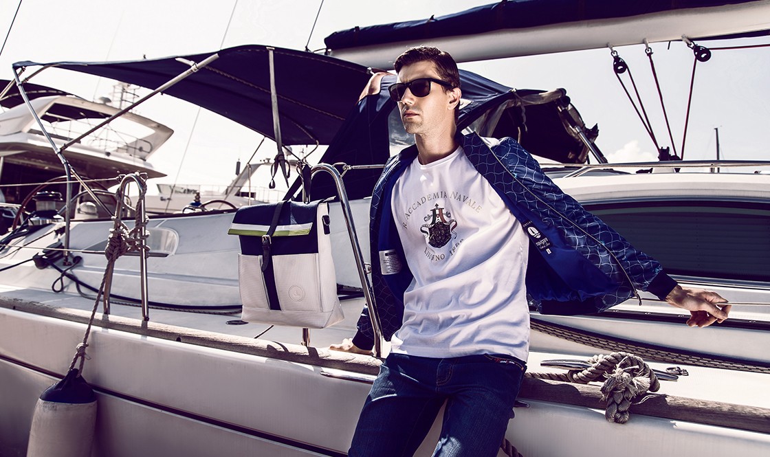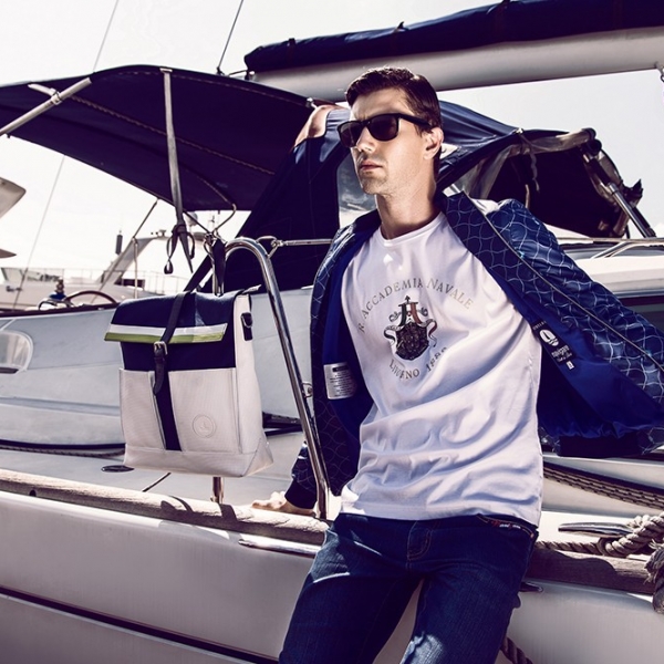 navigare2015春夏展示有關(guān)比薩的文化故事。在比薩城的livorno有一個意大利海軍學(xué)院—Livorno Naval Academy。海風(fēng)系列主要靈感來源于海軍學(xué)員元素,包括海軍制服,海軍制服圖形的印花襯衫、海軍勛章的印花短褲、金色金屬輔料等等,當(dāng)然在各種圖形中,將比薩的十字標(biāo)志融入到各中。同時運用了錫耶納賽馬會靈感,讓系列完整的呈現(xiàn)在比薩中。