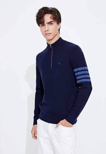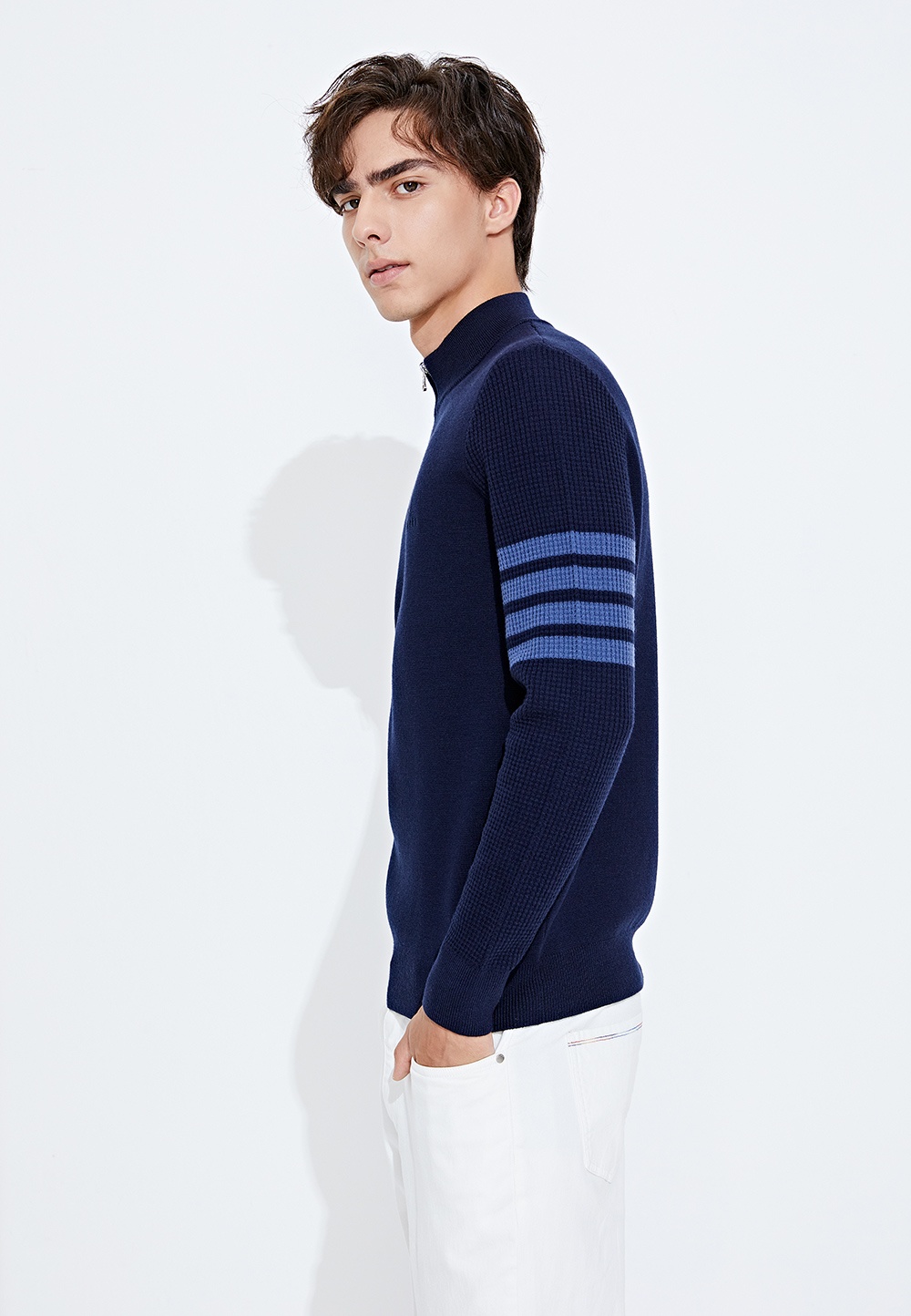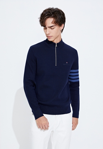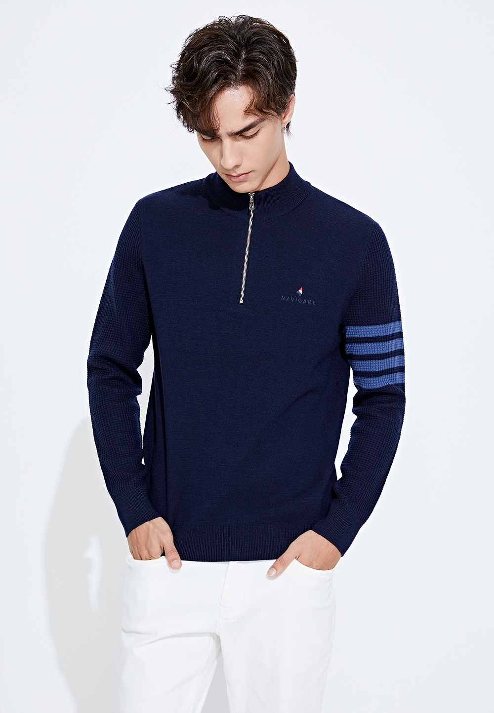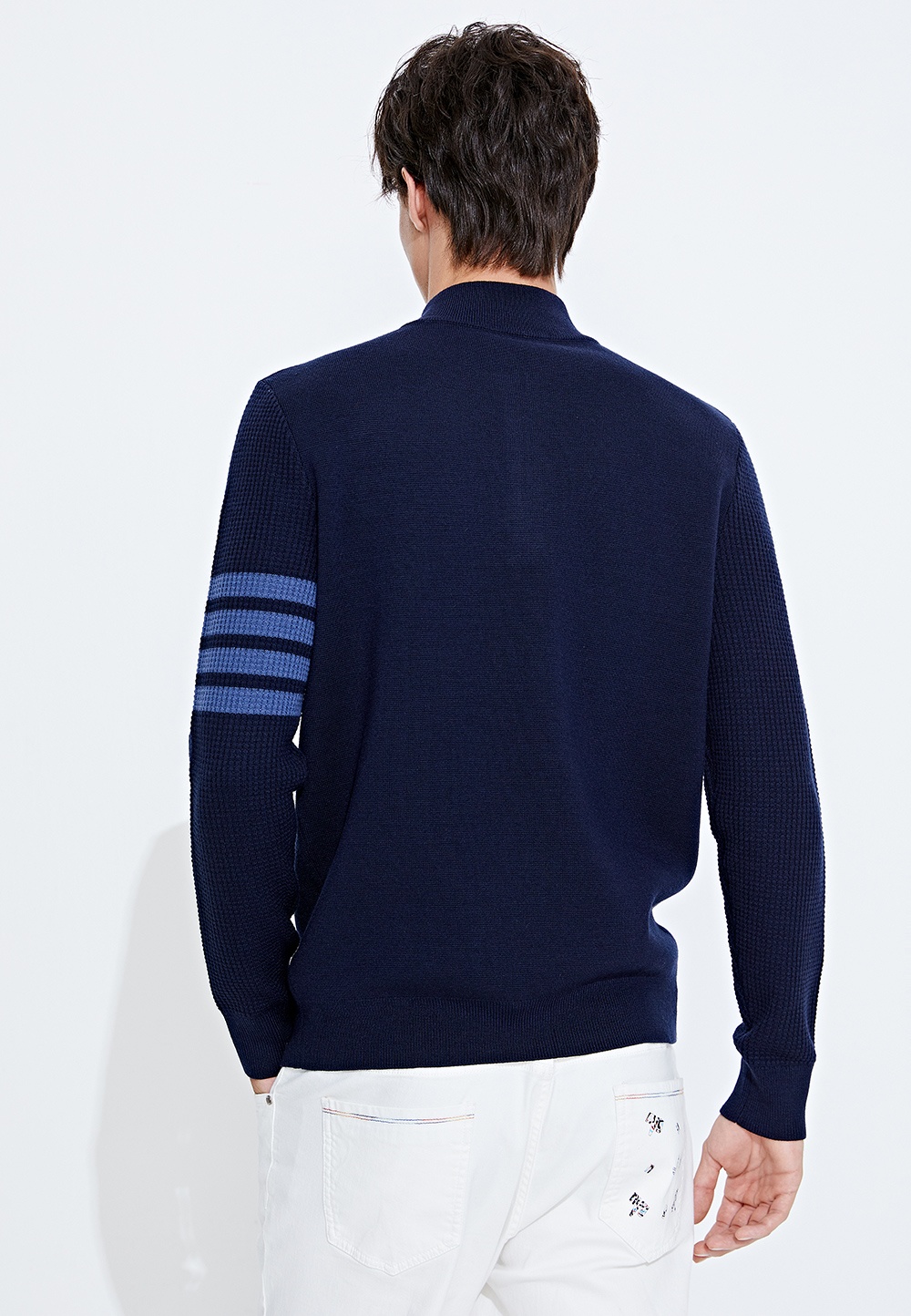 休閑深色半開領(lǐng)毛衣,拉鏈設(shè)計(jì)讓脫穿更便捷,胸前點(diǎn)綴品牌刺繡和袖子上的藍(lán)色條紋互相映襯,豐富色彩層次,強(qiáng)化視覺感受力,兼具美觀度與保暖性,帶來舒適體驗(yàn)。