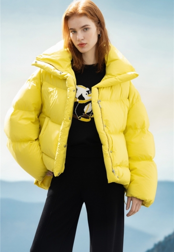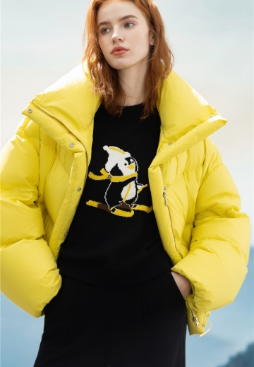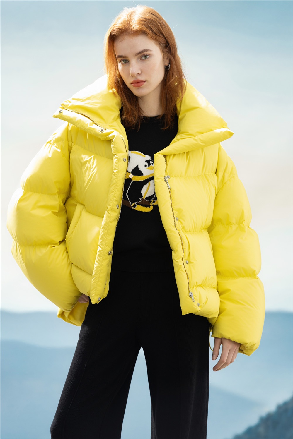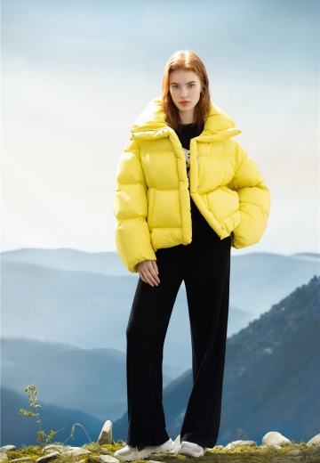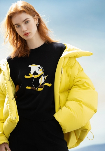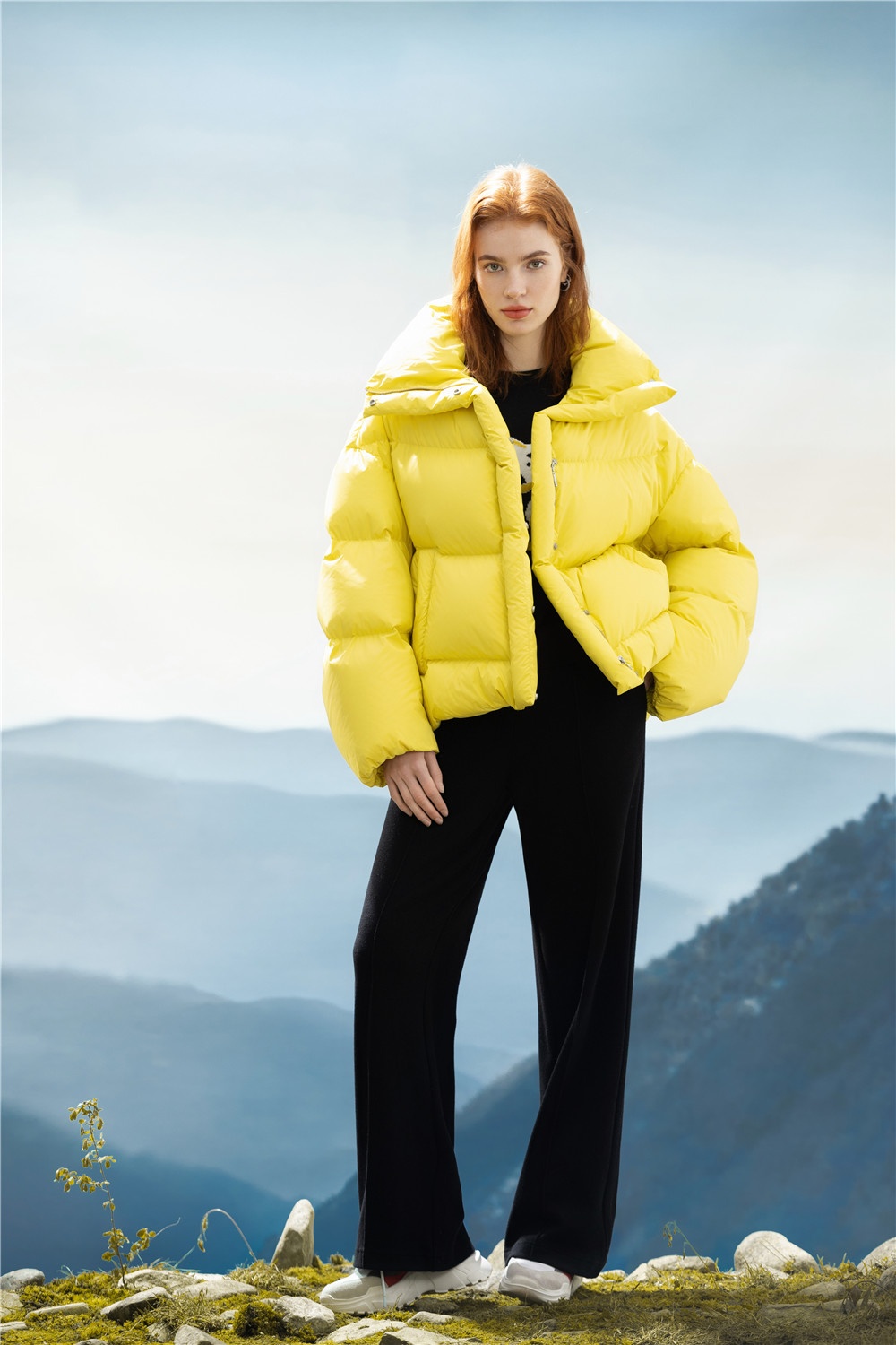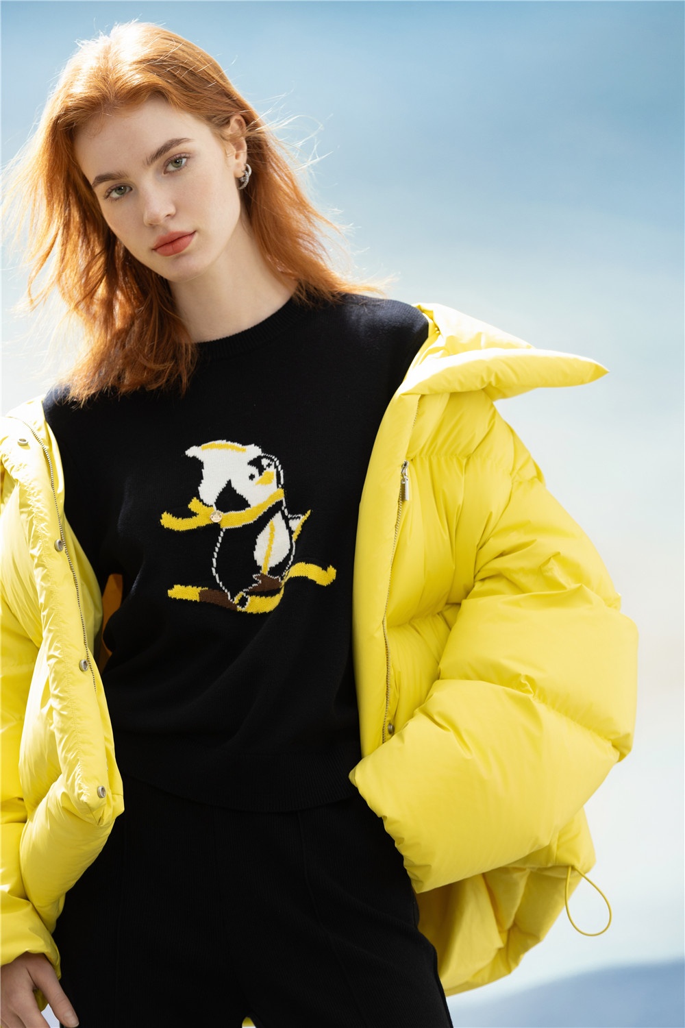 明媚的黃色給冬天留下一筆多巴胺式注腳,蓬松羽絨服,柔軟不顯臃腫,疊穿黑色毛衣搭配黑色直筒褲,胸口添加趣味圖案,構筑起鮮明而溫暖的個人空間,積蓄能量,療愈心境。