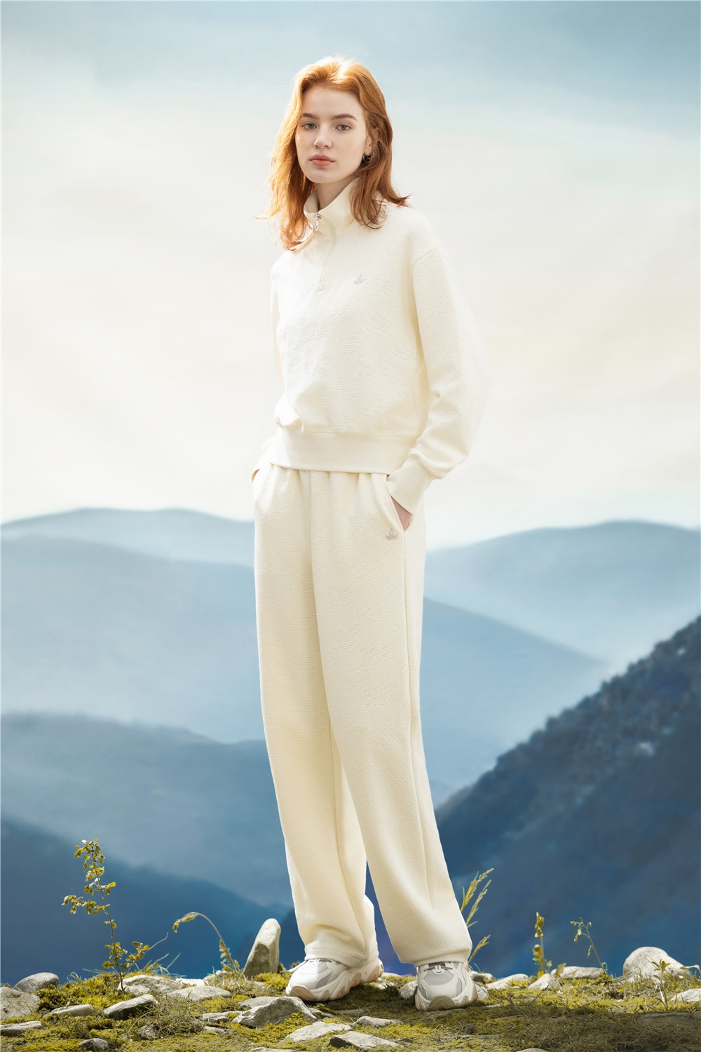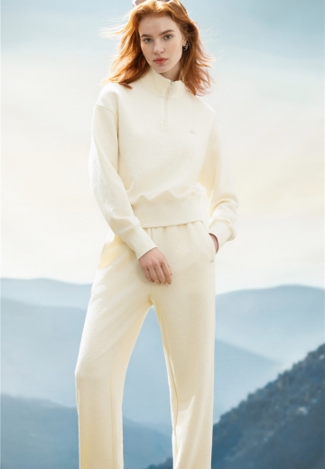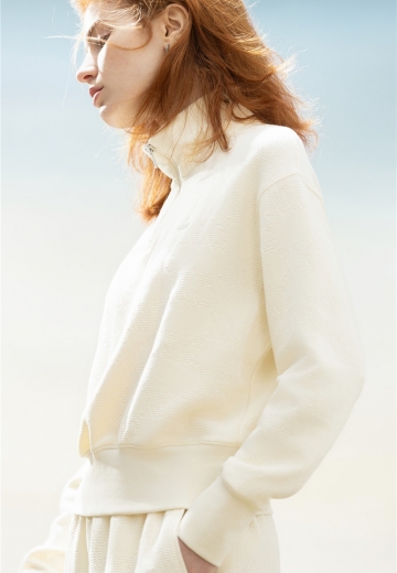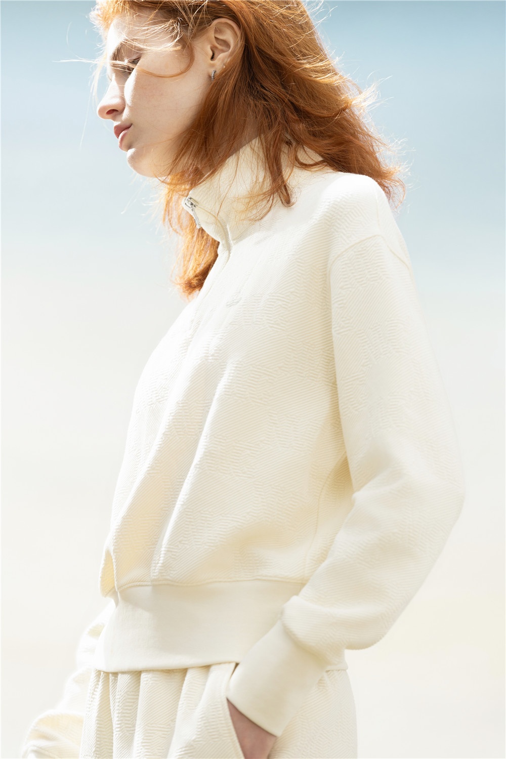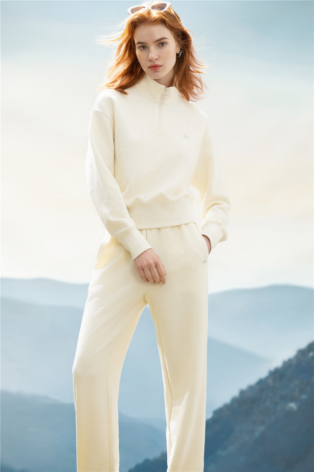 椰奶白開領(lǐng)衛(wèi)衣和同色休閑褲的順色搭配,簡(jiǎn)約廓形,柔亮色彩,柔軟面料映現(xiàn)奶油般細(xì)膩質(zhì)感,張弛有度呈現(xiàn)大方靈動(dòng)的美,在工作和生活之間探索平衡狀態(tài)。