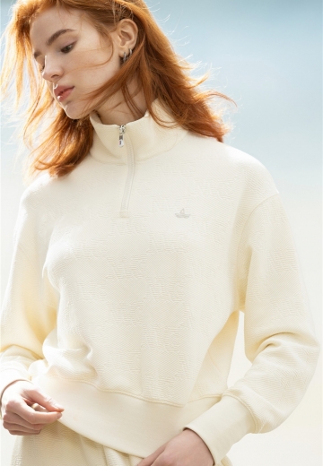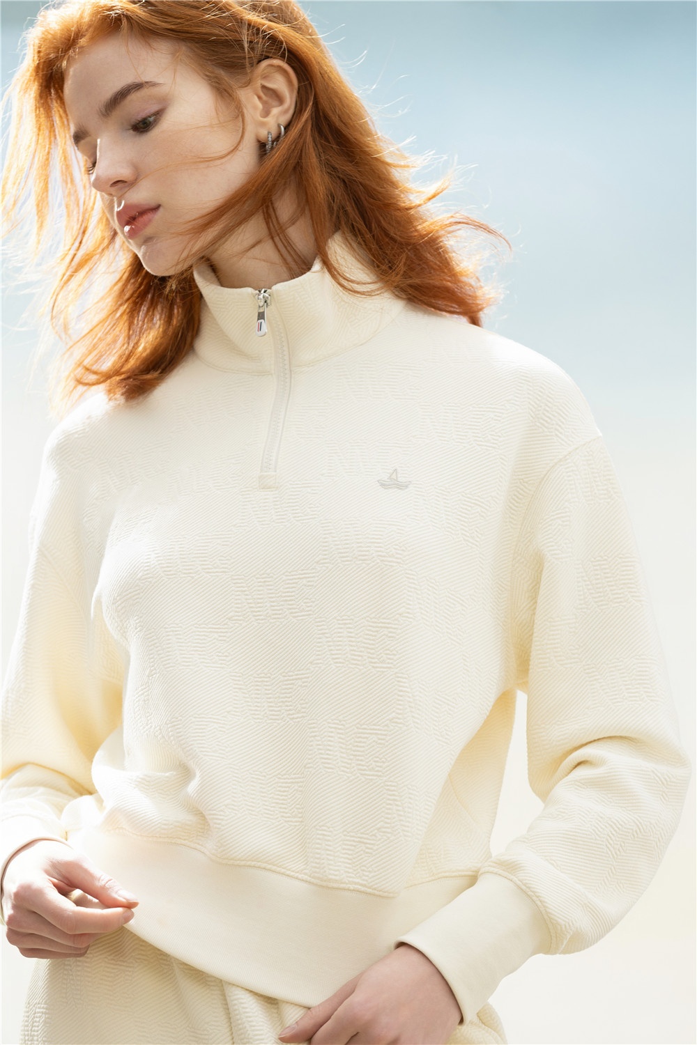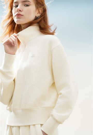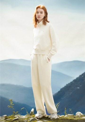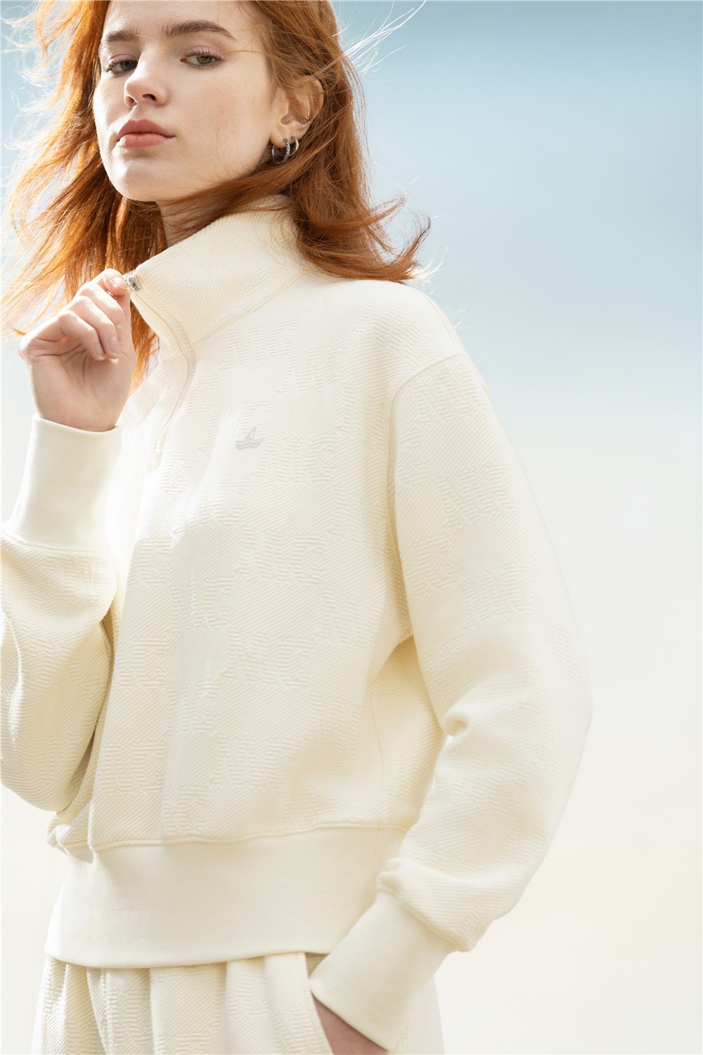 椰奶白開領(lǐng)衛(wèi)衣和同色休閑褲的順色搭配,簡(jiǎn)約廓形,柔亮色彩,柔軟面料映現(xiàn)奶油般細(xì)膩質(zhì)感,張弛有度呈現(xiàn)大方靈動(dòng)的美,在工作和生活之間探索平衡狀態(tài)。