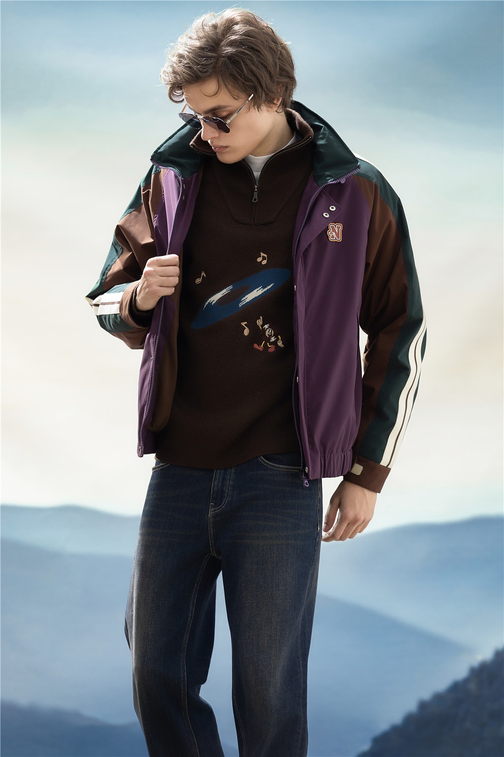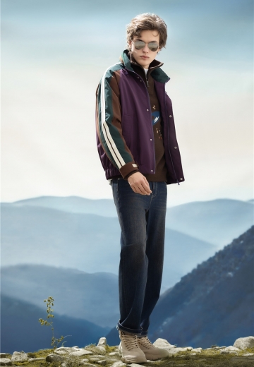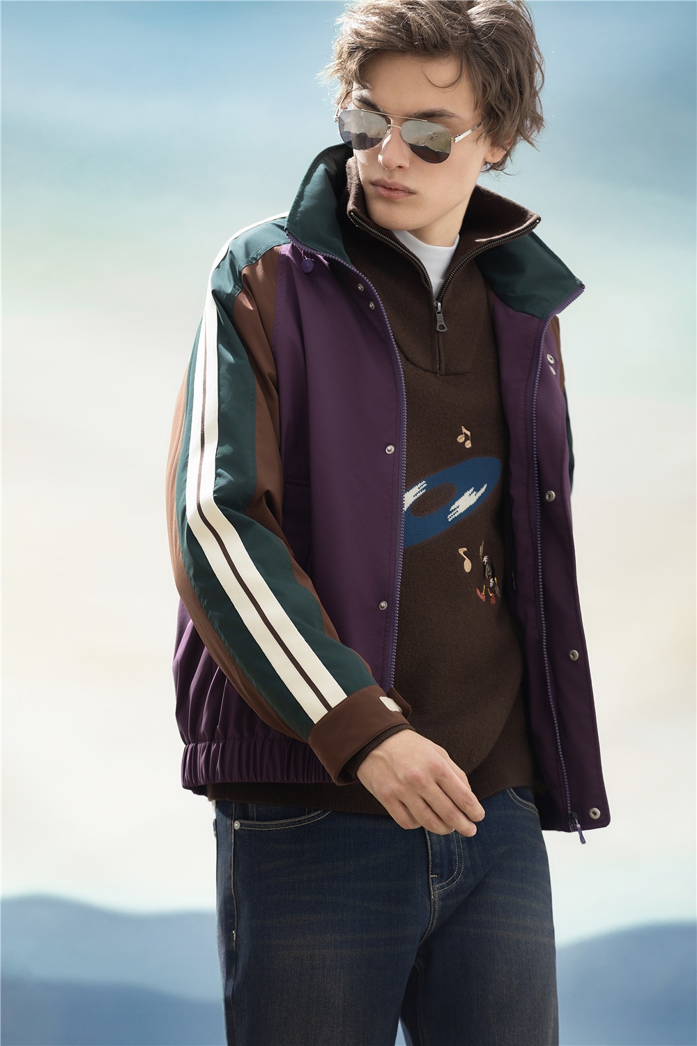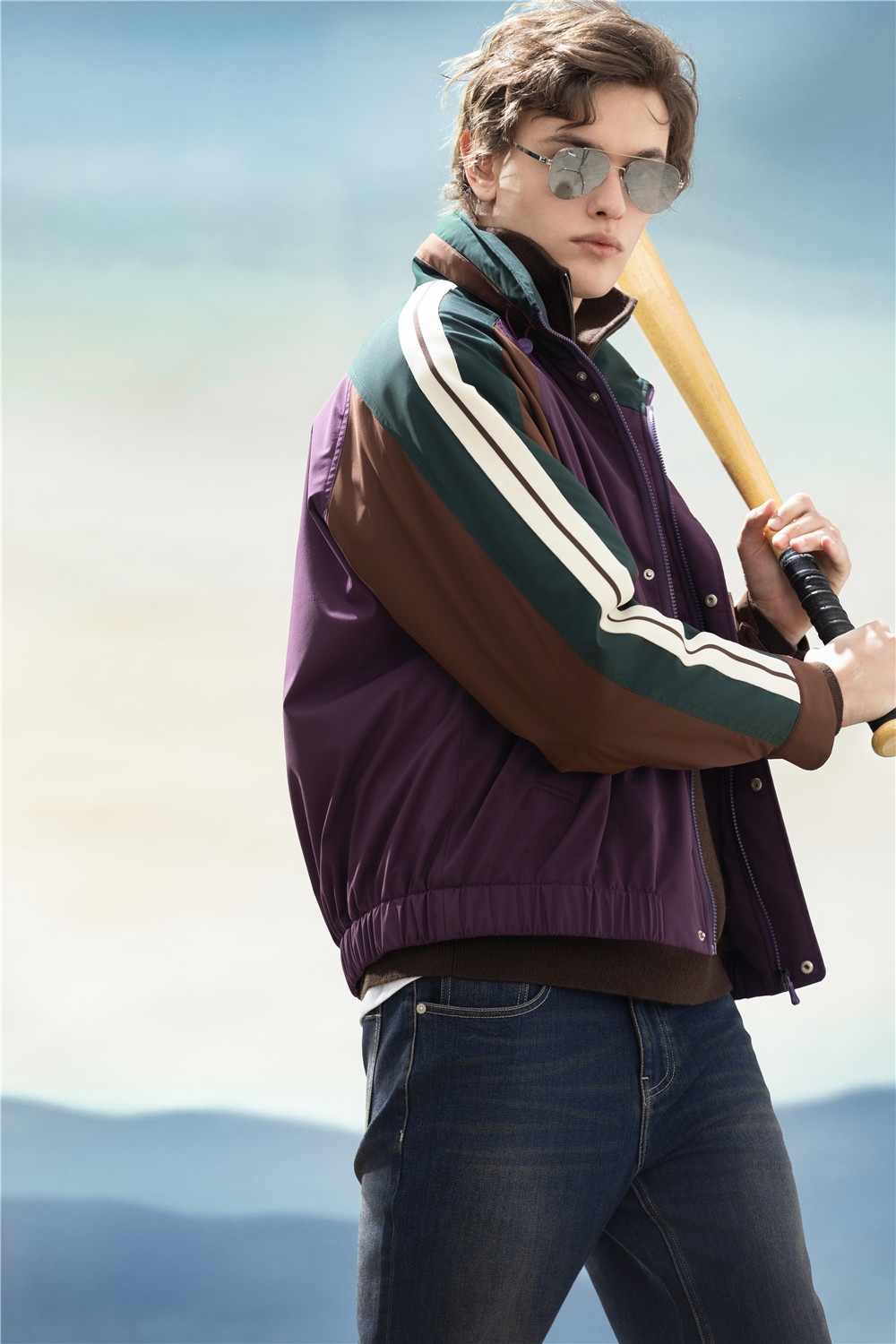 簡約翻領(lǐng)夾克融合多元色彩設(shè)計(jì),疊穿摩卡半開領(lǐng)毛衣,協(xié)調(diào)配色,驅(qū)散秋冬單調(diào)凝滯印象,搭配輕便牛仔褲,大開大合的線條勾勒灑脫不羈青春氣場,率性而自由。