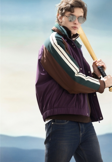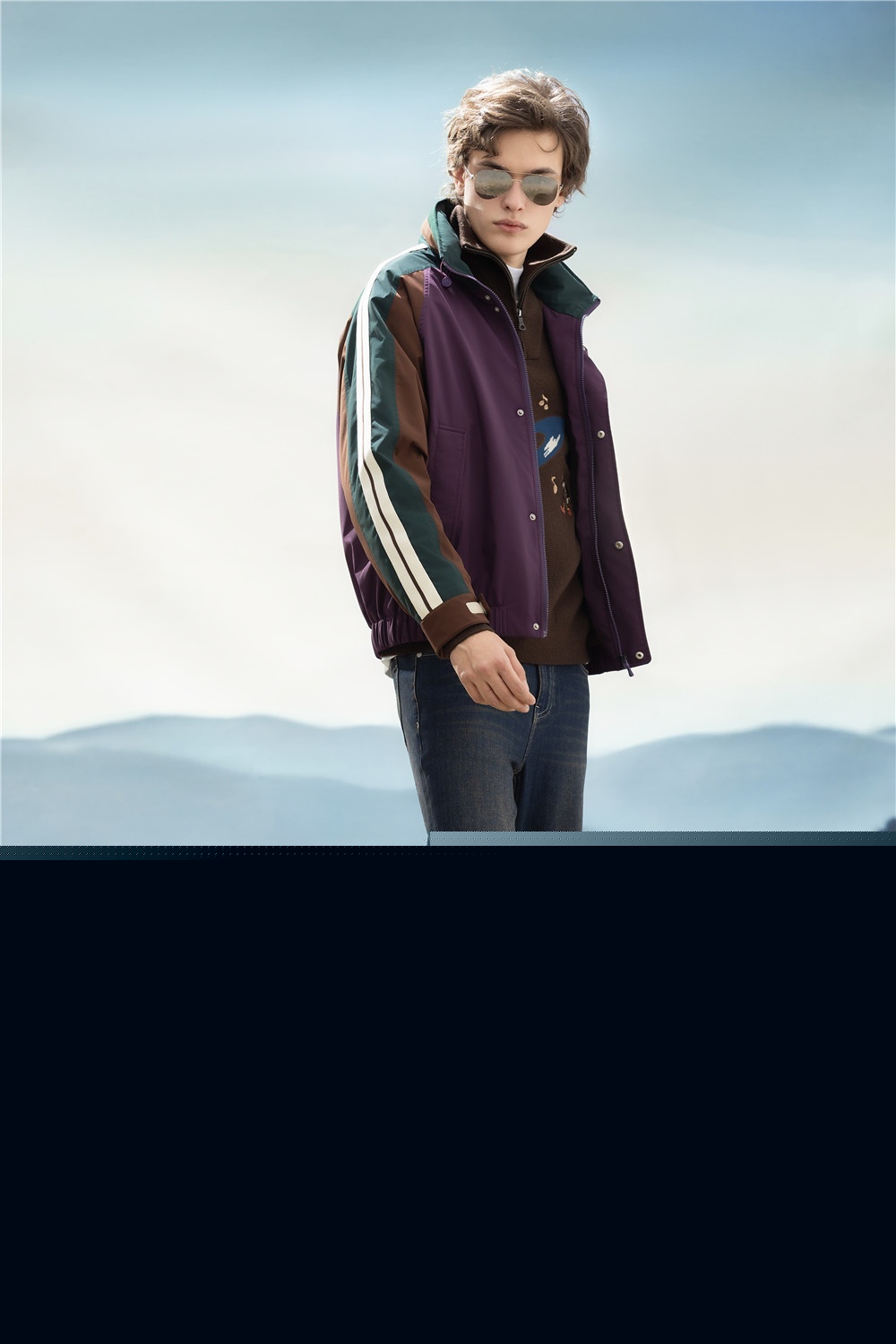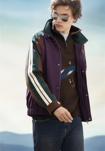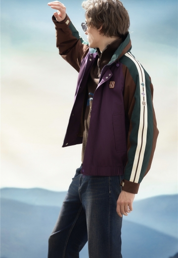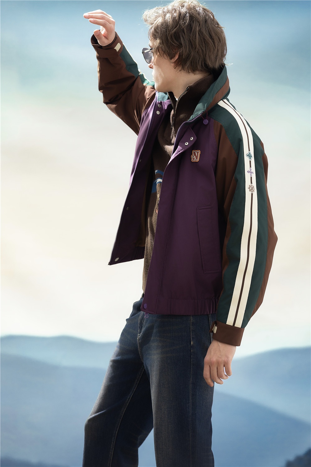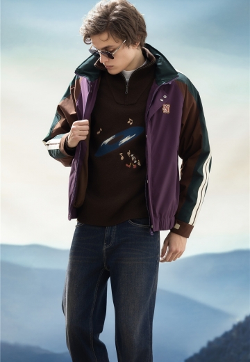 簡約翻領(lǐng)夾克融合多元色彩設(shè)計(jì),疊穿摩卡半開領(lǐng)毛衣,協(xié)調(diào)配色,驅(qū)散秋冬單調(diào)凝滯印象,搭配輕便牛仔褲,大開大合的線條勾勒灑脫不羈青春氣場,率性而自由。