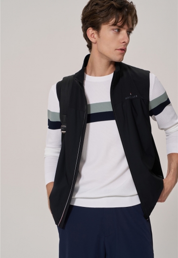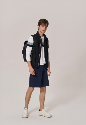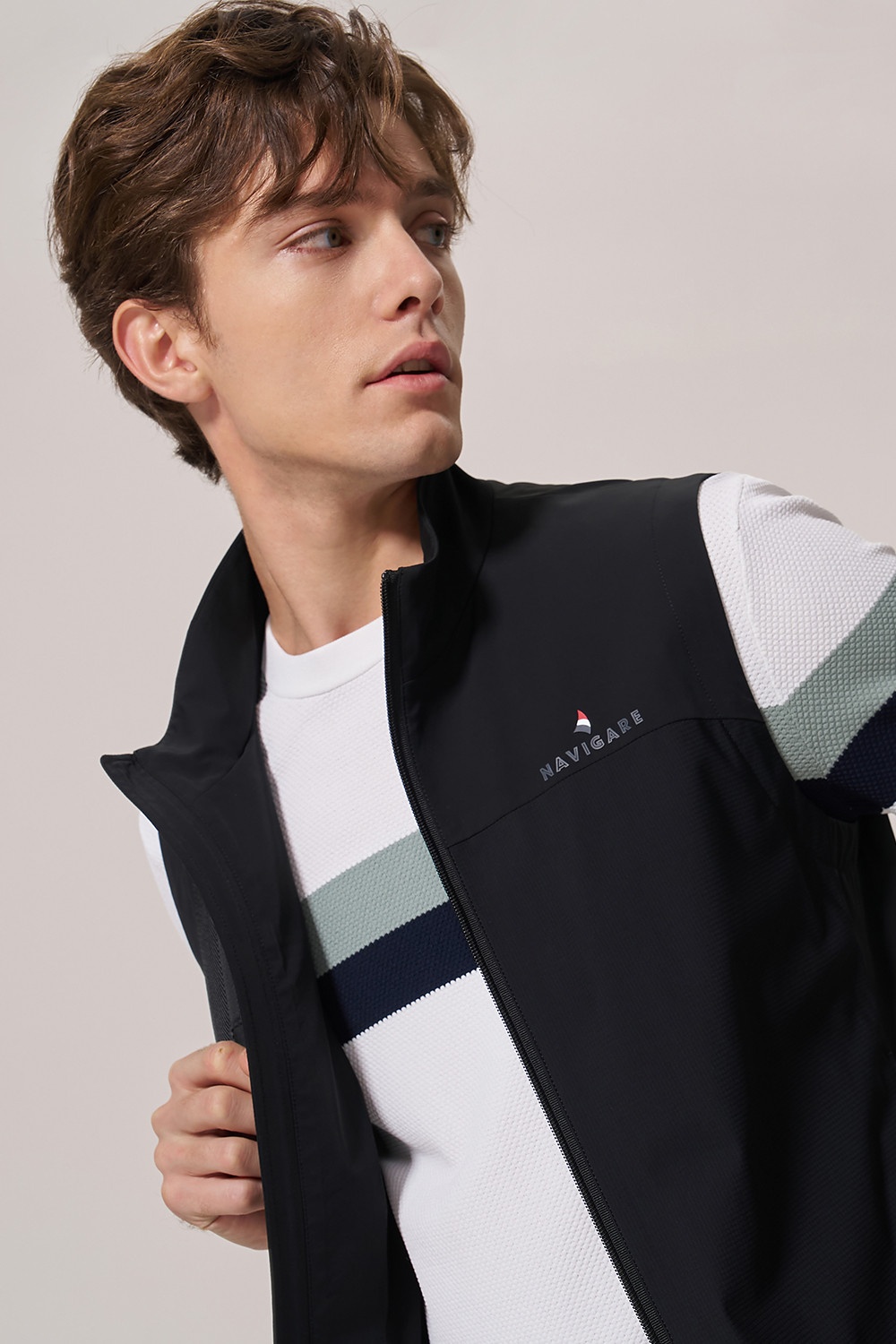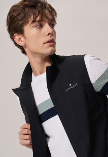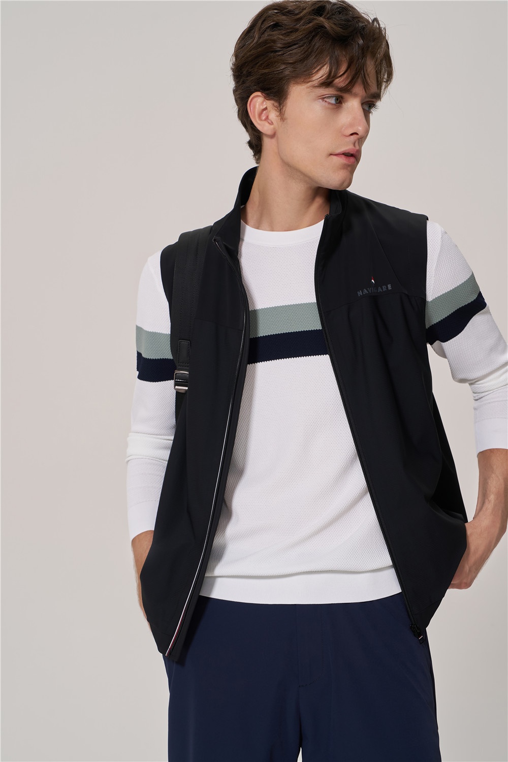 黑色系無袖外套,搭檔科技白條紋長袖圓領(lǐng)T,輕便舒適兼顧整體層次感,以簡約化色彩開拓出場景更多可能,擺脫束縛,率性表達(dá),助力春與夏時(shí)尚轉(zhuǎn)場。