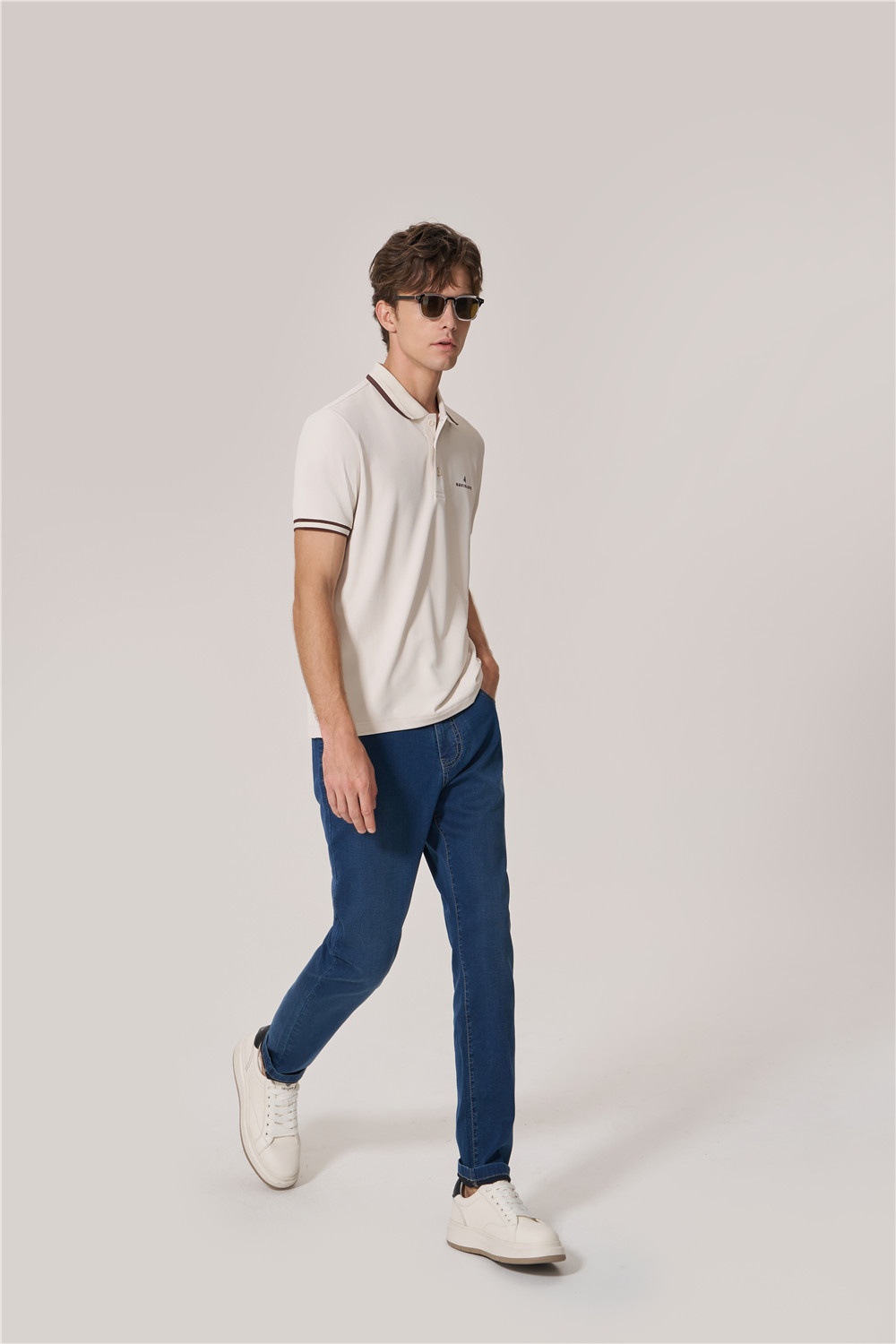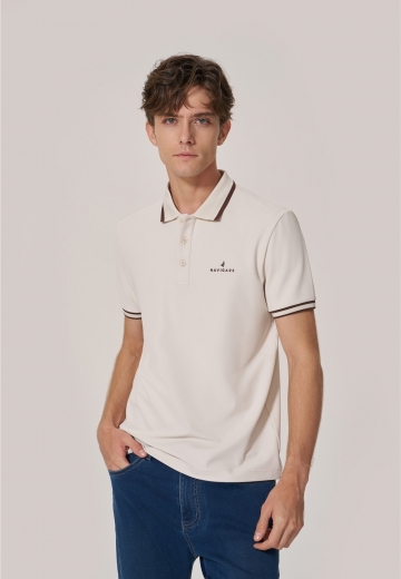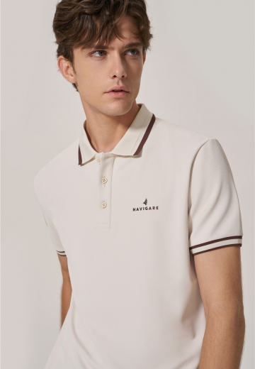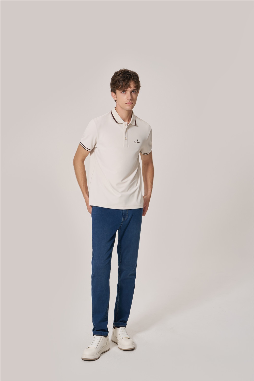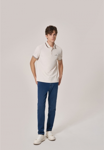 基礎(chǔ)款Polo撞色領(lǐng)口袖口條紋,胸口logo打破單調(diào)感,以燕麥咖詮釋色彩的溫潤與雅致,搭配微錐型牛仔褲,助力通勤和假日自如切換。