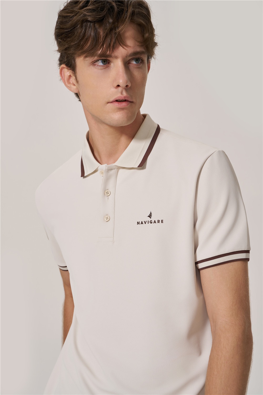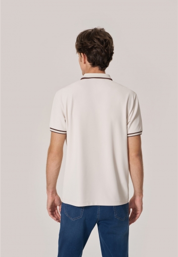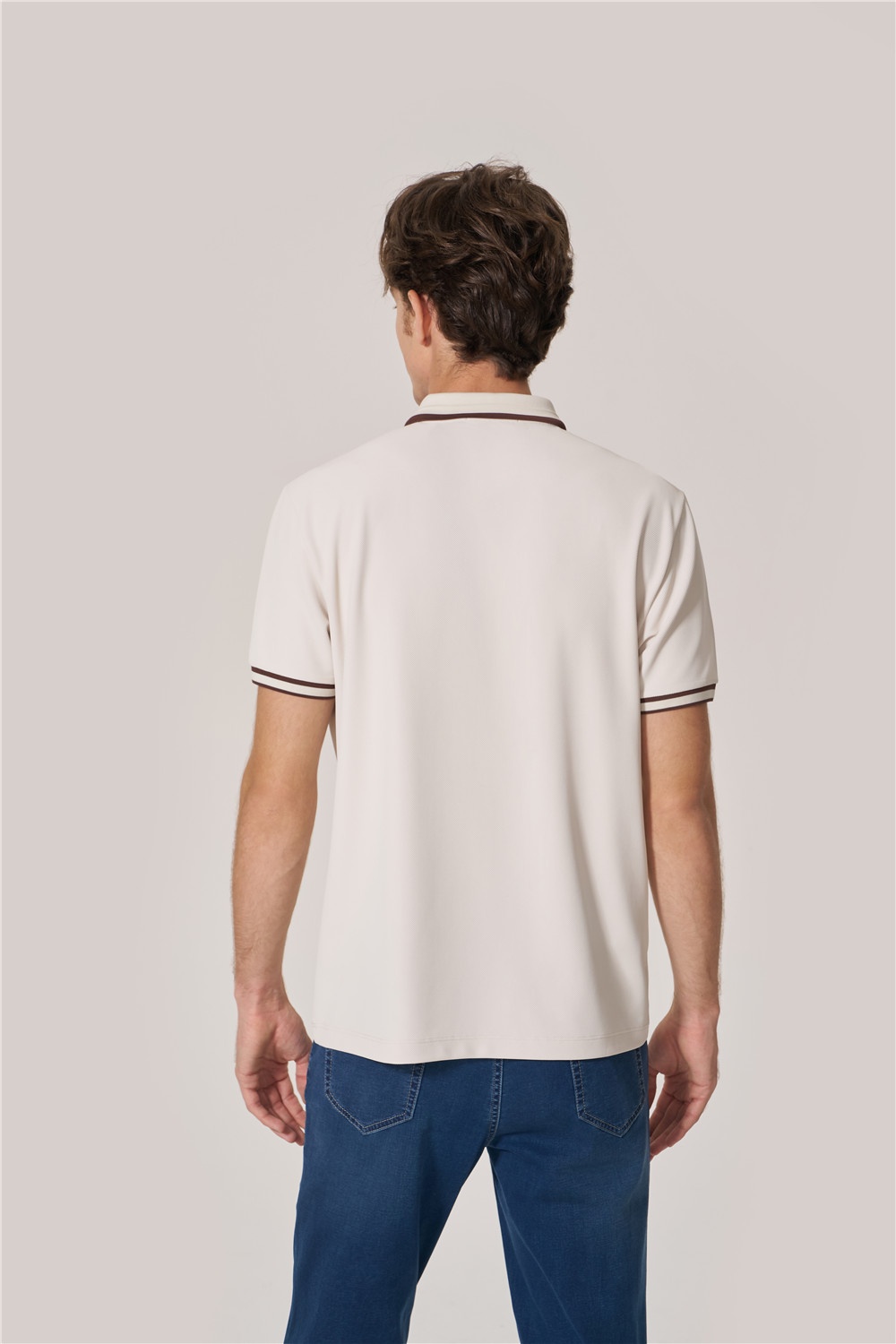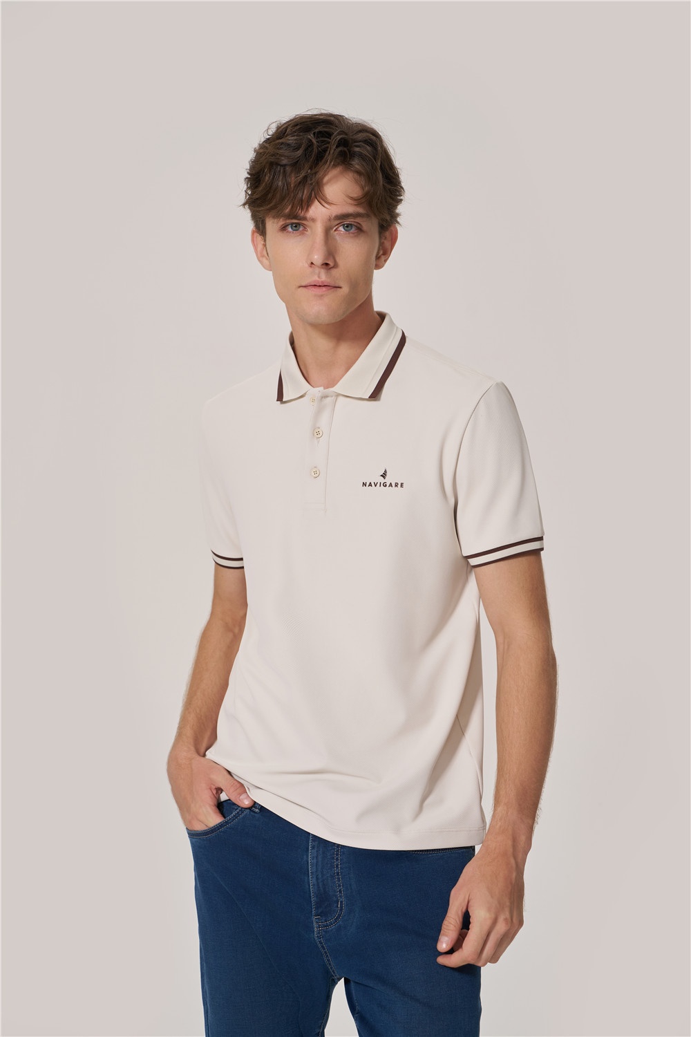 基礎(chǔ)款Polo撞色領(lǐng)口袖口條紋,胸口logo打破單調(diào)感,以燕麥咖詮釋色彩的溫潤與雅致,搭配微錐型牛仔褲,助力通勤和假日自如切換。